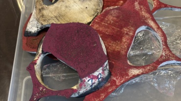 Karen Bjerregaard har arbejdet på produktionen af en serie store værker til udstillingen, Det man ikke ser, i Pakhusgalleriet Nykøbing Sjælland. Arbejdet på Statens Værksteder har gjort det muligt at sy lærreder, implementeret med sejlringe, og eksperimentere med knogletryk i en stor, rumlig væginstallation.