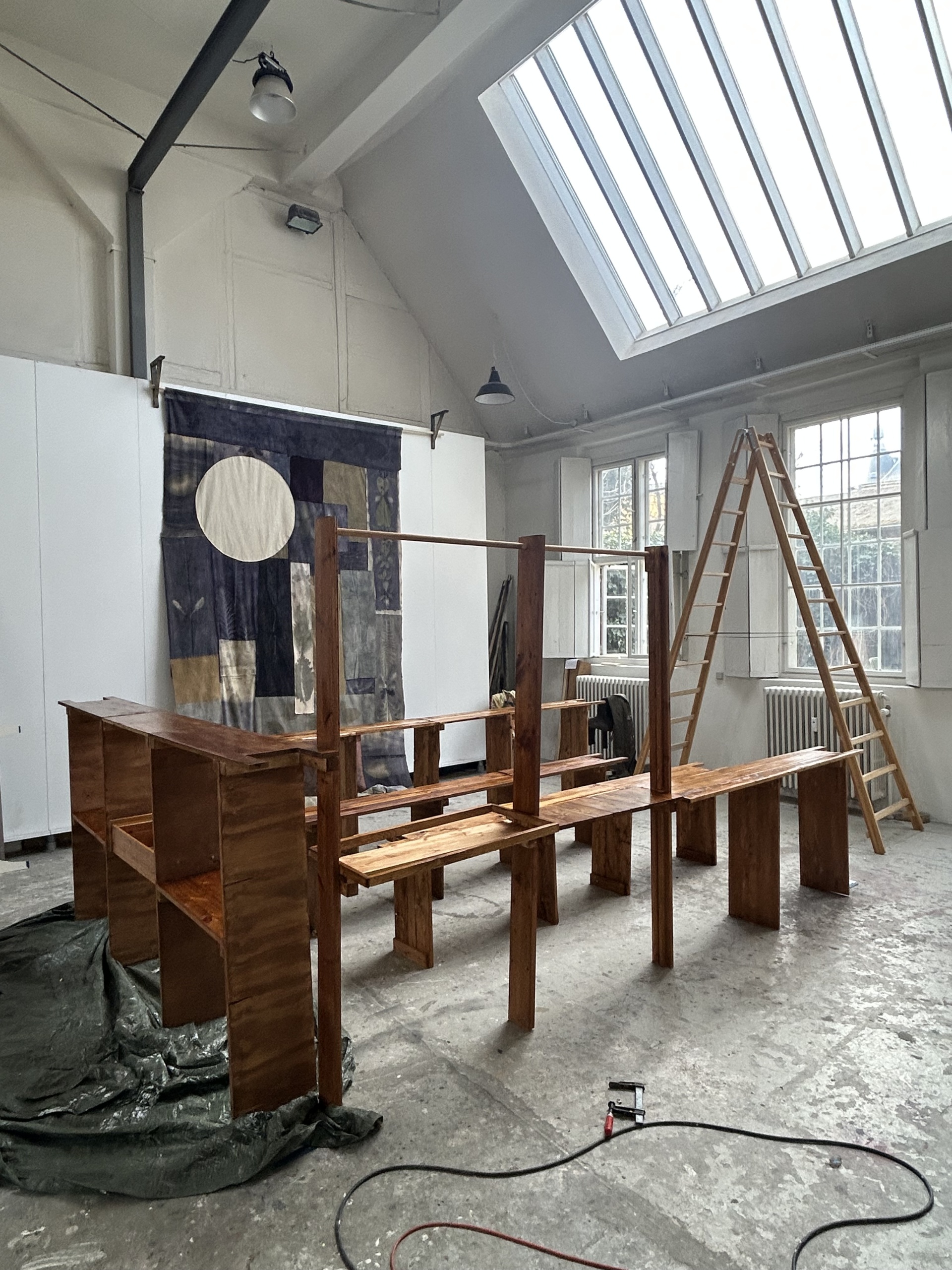 Arbejdet er udført i Anne Marie Carl Nielsens atelier ved Frederiksholm kanal. Opholdet har været ideelt til dette projekt, da atelieret både har den nødvendige gulvplads til at komponere det tekstile værk, den gode loftshøjde til at afprøve ophængningen og i tillæg det lille træværksted, hvor kunstnerne har arbejdet på træreolen.